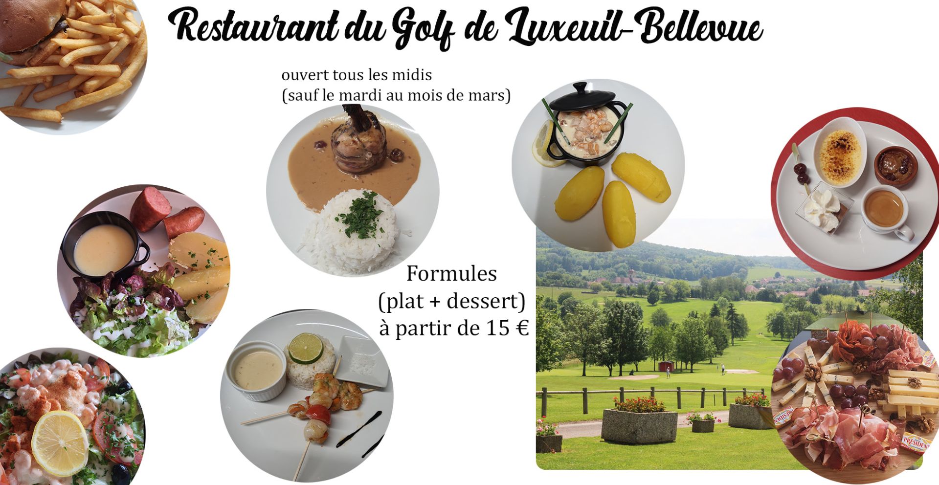 Le restaurant du golf vous accueille tous les midis sauf le mardi (ouvert tous les jours à partir du 1er avril) et vous propose des formules (plat + dessert) à partir de 15€.